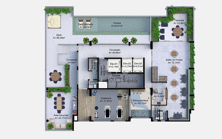 A área de lazer do empreendimento está localizada no rooftop. Por lá estará disponível piscina adulto e infantil, deck molhado, academia, brinquedoteca, espaço gourmet, além do tradicional salão de festas.
